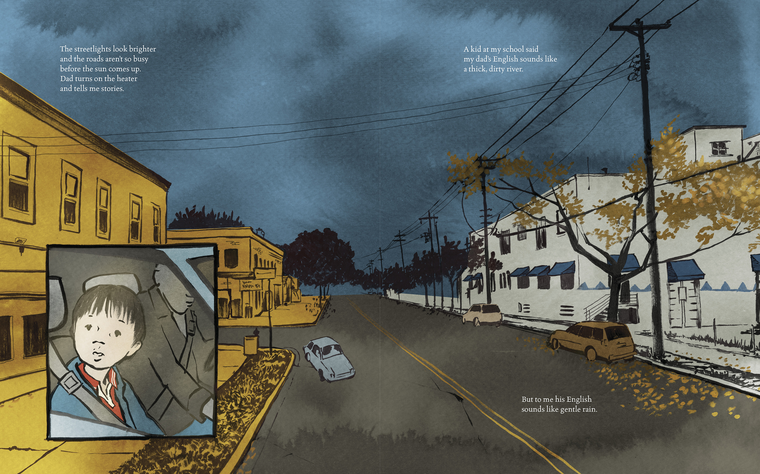 Thi Bui was truly the perfect illustrator for this picture book. Her illustrations are ethereal, capturing that bleary-eyed feeling of waking up before the sun rises, but also incorporating rich oranges and blues (which are complementary colors) that allow Thi to highlight specific bits of each illustration. The illustrations themselves are inked, with what looks like gouache coloring, so they hearken back to traditional Vietnamese artwork while still maintaining a vibrant, modern look. The technique is a beautiful visual marriage between living in a new world and maintaining tradition, the very two concepts the text explores.