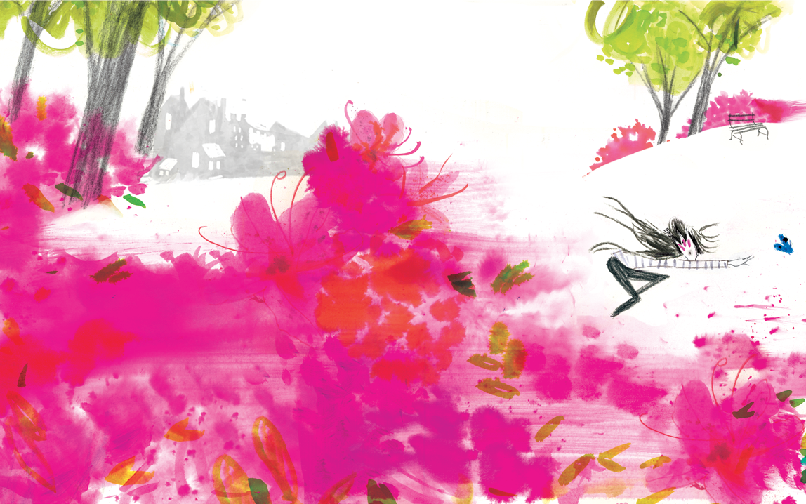 Black tights and stripes would help readers follow her movement against a world of moving color and texture. Later on, my editor, Alessandra Balzer, and art director Martha Rago and I would chat about the idea of making her more colorful, since she loved colors so much. I experimented with face paint, imagining that her romps with color might leave swipes and markings on her face.